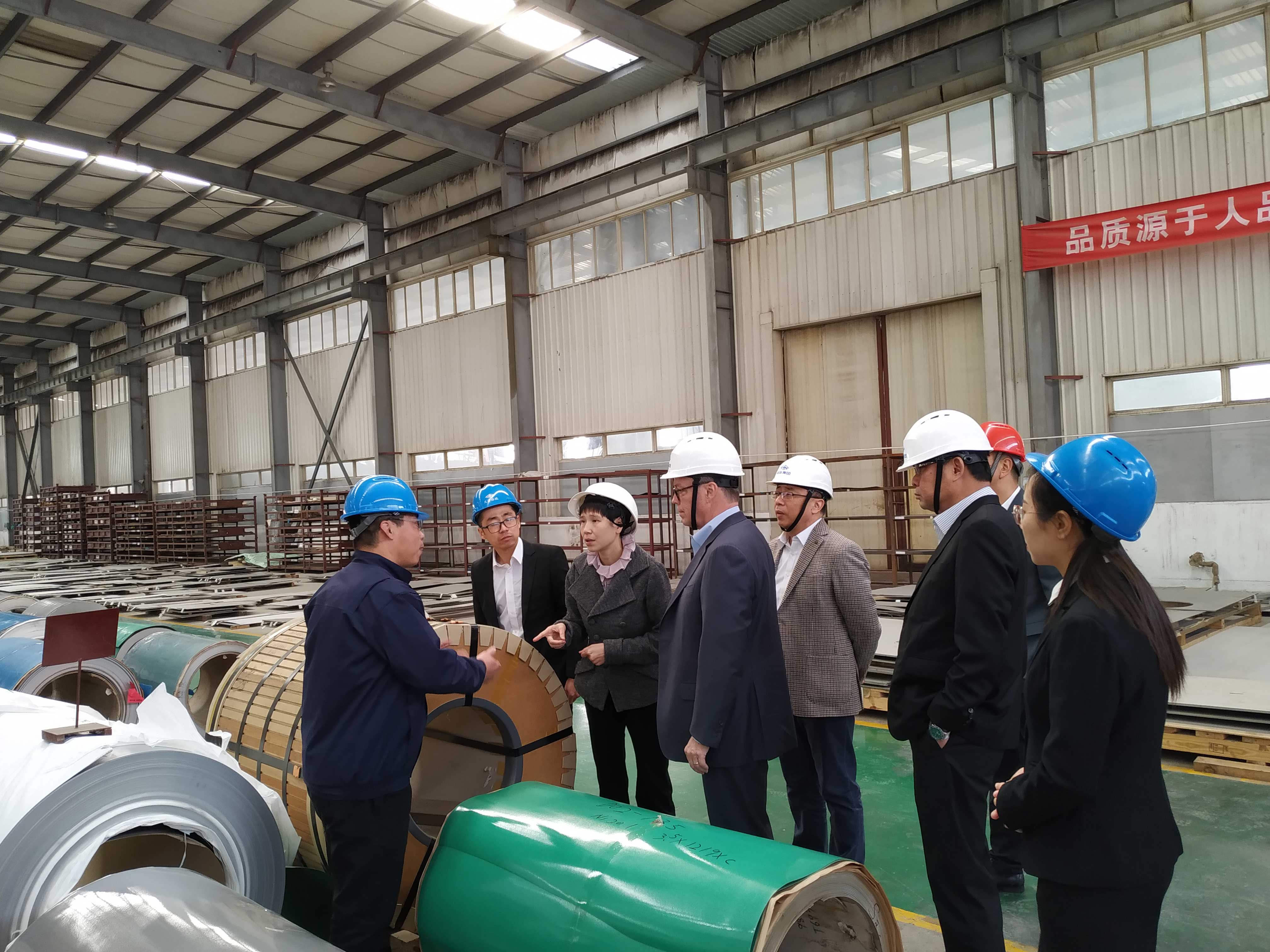 首先一行人參觀了格瑞剪切加工中心及庫房,期間Kevin B. Kramer先生和Vincent Fu先生分別對我司設備情況及庫房倉儲情況進行了了解,二人了解情況后對我司以客戶為導向的“快而精”的運營模式及倉儲量給予了高度贊揚,并表示希望與格瑞集團有更深入的合作。